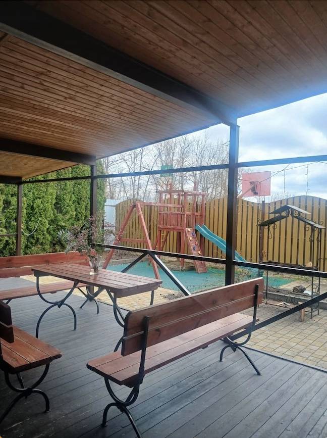 6. Для детей. Внутри есть игровая комната с теплыми полами и небольшим надувным бассейном. На улице игровой комплекс с горкой, а в жаркое время устанавливают каркасный бассейн. Немаловажно и то, что стол в основной комнате расположен прямо напротив детской комнаты и с него видно сквозь панорамные двери уличное пространство с детским комплексом.